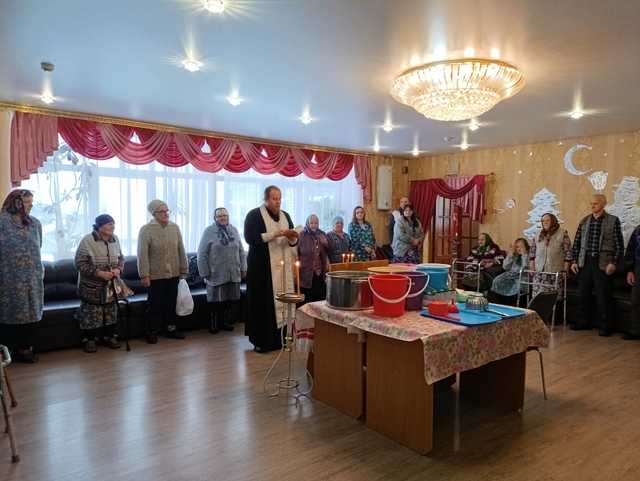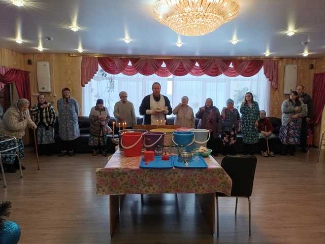 Иерей Алексей совершил Великое освещение воды и окропил всех проживающих и сотрудников учреждения .